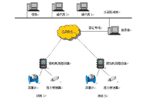 城市供水管網(wǎng)監(jiān)測(cè)系統(tǒng)是水司供水調(diào)度管理系統(tǒng)的一個(gè)子系統(tǒng),主要由自來水廠調(diào)度中心、通信平臺(tái)、監(jiān)測(cè)終端、壓力變送器和流量?jī)x表組成。