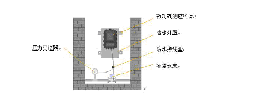 將防水外罩安裝在監(jiān)測(cè)井井壁上,微功耗測(cè)控終端放置在防水罩內(nèi)。壓力變送器信號(hào)線、水表信號(hào)線接在微功耗測(cè)控終端自帶的防水接線盒上。