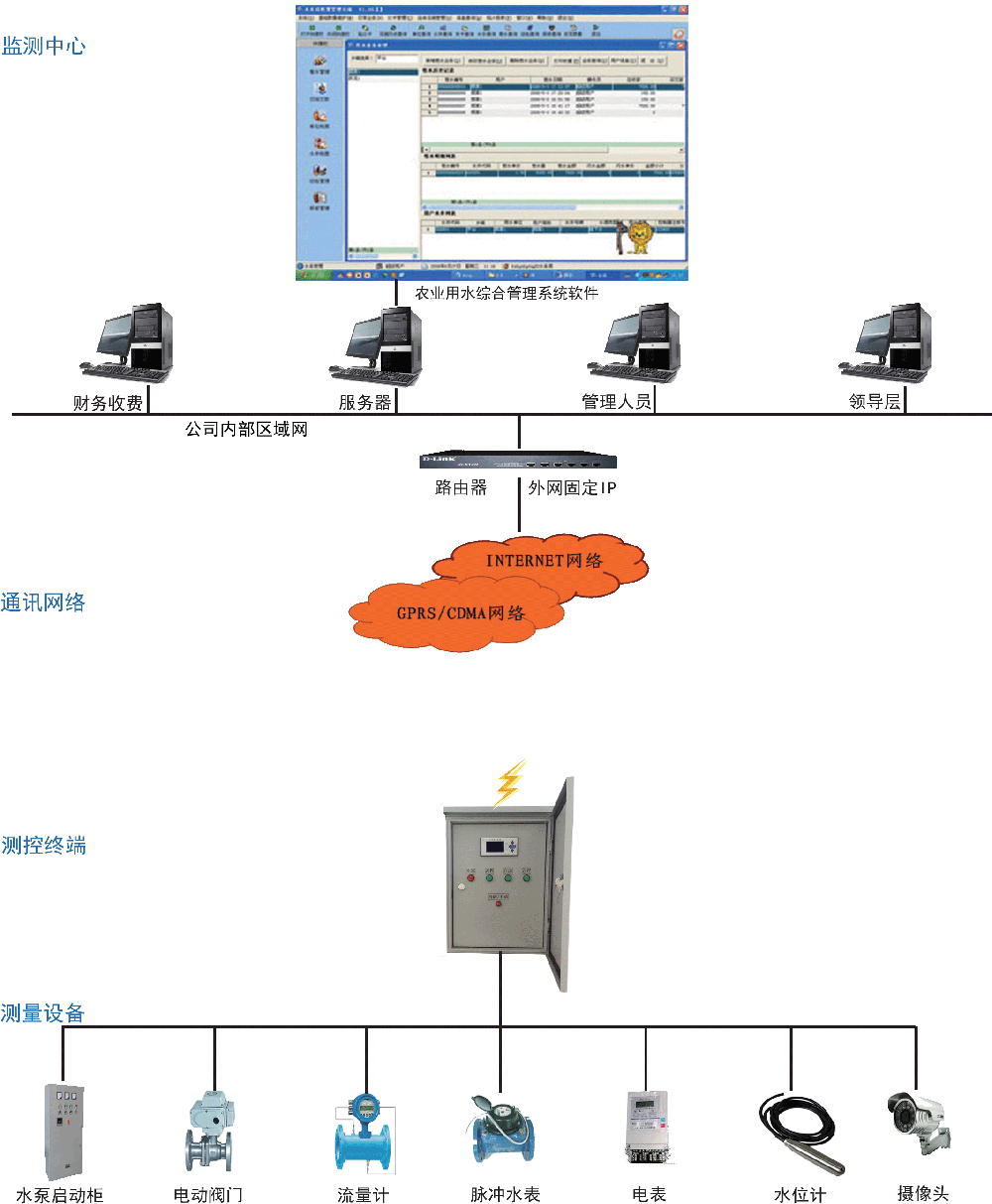 一、系統(tǒng)簡(jiǎn)介 農(nóng)業(yè)用水綜合管理系統(tǒng)中機(jī)井灌溉IC卡收費(fèi)控制是該系統(tǒng)的核心,它將機(jī)井灌溉控制器、交流接觸器以及配電設(shè)備安裝在一個(gè)機(jī)箱內(nèi),可以采集灌溉用電量、用水量或灌溉時(shí)間并自動(dòng)收取灌溉費(fèi)用。農(nóng)田機(jī)井灌溉收費(fèi)控制箱不僅使管理部門實(shí)現(xiàn)了先收費(fèi)、后灌溉的管理目標(biāo);也使農(nóng)戶達(dá)到了借助IC卡自主澆地的目的。同時(shí)也成功解決了農(nóng)業(yè)機(jī)井灌溉管理中長(zhǎng)期存在的電費(fèi)/水費(fèi)計(jì)量不準(zhǔn)、拖欠灌溉費(fèi)用和浪費(fèi)水資源的難題。 二、系統(tǒng)組成 v 監(jiān)控中心:中心服務(wù)器、外網(wǎng)固定IP、水資源管理系統(tǒng)軟件、收費(fèi)管理系統(tǒng)軟件; v 通信網(wǎng)絡(luò): 基于移動(dòng)無(wú)線GPRS或電信無(wú)線CDMA網(wǎng)絡(luò); v 采集控制終端:IC卡控制終端、GPRS/CDMA DTU; v 計(jì)量?jī)x表:流量計(jì)/水表/電表、水泵控制柜/電動(dòng)閥門。